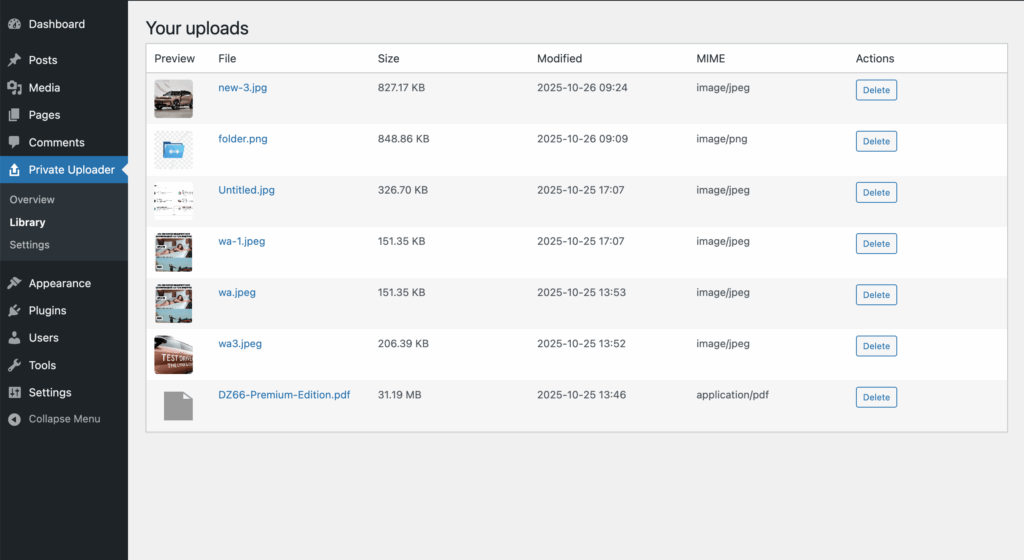 Preview, browse, and manage uploads directly from your WP dashboard.